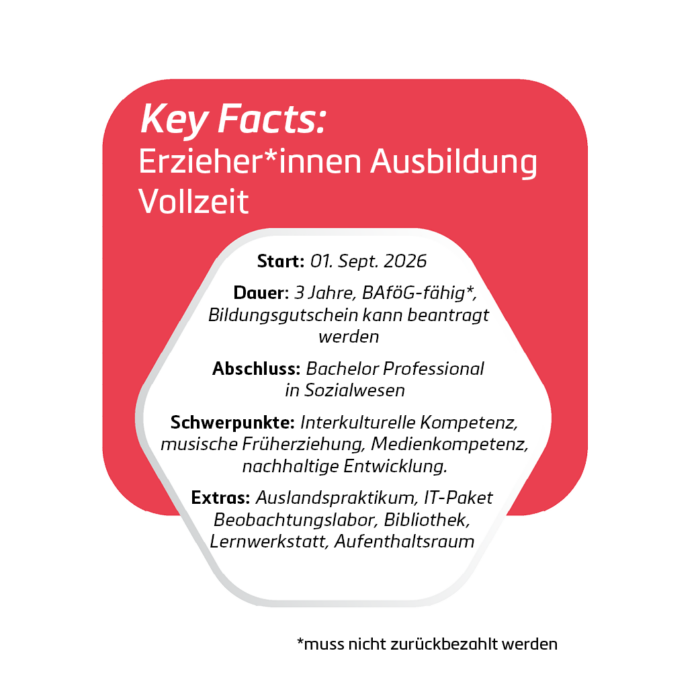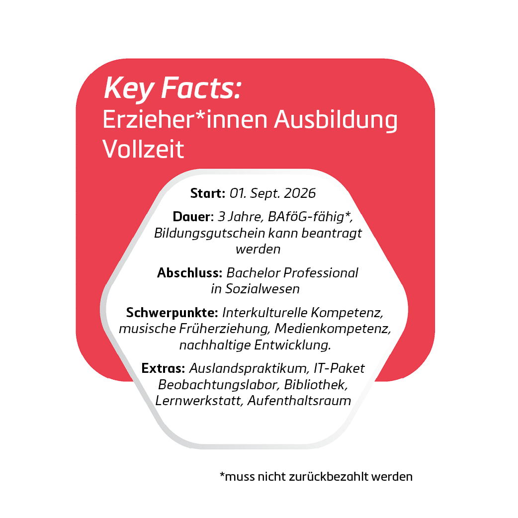 Die Ausbildung zur Erzieherin / zum Erzieher erfolgt in Vollzeit (schulisch), verbunden mit einschlägigen Praktika. Nach der erfolgreichen Ausbildung haben Sie einen staatlich anerkannten Abschluss erworben.